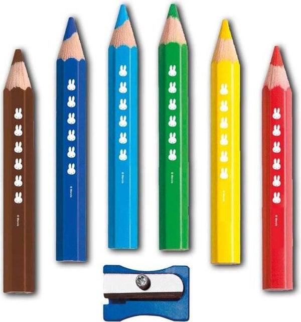 Deze extra dikke en korte nijntje kleurpotloden zijn speciaal gemaakt voor gebruik door de allerkleinsten. De set bestaat uit 6 potloden in heldere kleuren en een speciale slijper. Gebruik voor het slijpen de bijgevoegde kleurpotlodenslijper, dat geeft nog langer plezier van de kleurpotloden.