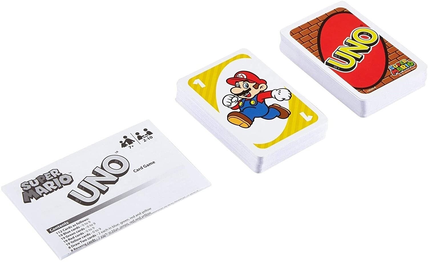 Doe samen met Mario, Luigi en al hun vrienden een speciaal spelletje UNO! Dit is het klassieke UNO spel waar je dol op bent, maar nu met een speciale Mario Super Star-kaart die jou onoverwinnelijk maakt! Nadat een andere speler een Neem-twee of Neem-vier keuzekaart speelt, kun jij de Super Star-kaart spelen en moet de vorige speler twee of vier kaarten pakken! Scoor punten door in elke ronde als eerste speler al je kaarten kwijt te raken. De eerste speler of het eerste team dat 500 punten haalt is de winnaar. En vergeet vooral niet UNO te roepen als je nog één kaart over hebt! Bevat 112 kaarten en een eenvoudige gebruiksaanwijzing. Wordt geleverd in full-colour doosje. Voor 2 tot 10 spelers van 7 jaar .