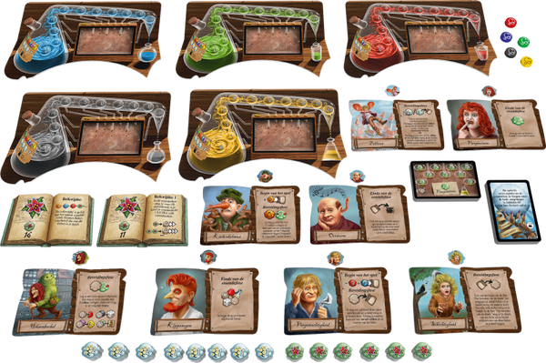 De alchemisten van Kakelenburg zijn inmiddels tot ver voorbij de grenzen van de stad bekend. Hun geneeskunst is even beroemd als berucht. Hulpzoekenden komen van ver om hun, meestal exotische, klachten "vakkundig" te laten behandelen door de wonderdokters. Hier worden de besten uit jullie gilde gevraagd: de alchemisten van Kakelenburg pakken de moeilijkste gevallen van het kwakzalversvak aan. Met hoogwaardige technische apparatuur destilleren ze de beste toversoep om het lijden van de patiënten te verminderen. Door destilleren krijgen de spelers waardevolle bonussen en speciale vaardigheden, die hen in de loop van het spel voordelen bieden. Verder bevat deze uitbreiding 20 nieuwe waarzeggerijkaarten en 2 nieuwe ingrediëntenboeken voor het narrenkruid. Uitbreiding Basispel ‘De Kwakzalvers van Kakelenburg’ vereist! Om met 5 spelers te kunnen spelen, is ook de uitbreiding ‘De kruidenheksen’ vereist.