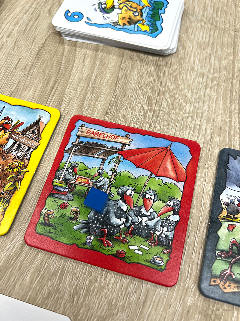 Vlot blufspel voor het hele gezin! Het pluimvee op de boerderij houdt een groot buffet. De vossen uit de omgeving eten ook graag mee, maar die hebben duidelijk een ander beeld van de samenstelling van het menu. Speel pluimveekaarten om graankorrels te verzamelen en vossenkaarten om juist pluimvee te verschalken. De locaties waar je de kaarten naartoe stuurt, bepalen wie er met de buit vandoor gaat.