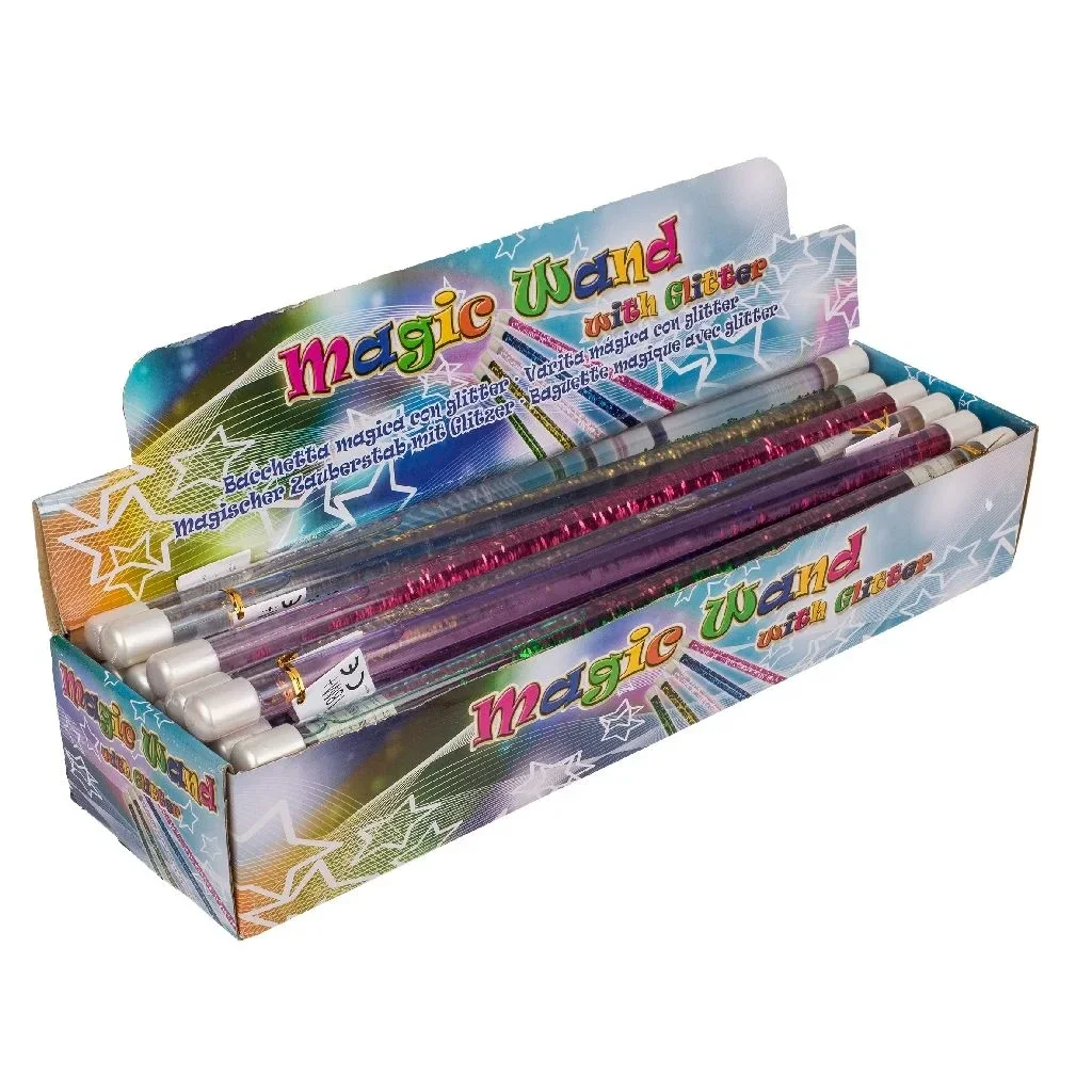 Deze prachtige magische toverstaf is gevuld met glitter en kleurrijke vloeistof en is 46 cm lang. Draai de lange toverstaf heen en weer en zie de glitter naar de bodem drijven. Er zijn 6 verschillende staffen met kleurrijke glitter en zandachtige kralen met inhoud in rood, wit, groen, blauw, goud en roze. De magische glitter dwarrelt heen weer met elke golf van de toverstaf. Met deze prachtige en betoverende toverstaf stimuleer je de hand, oogcoördinatie van je kind. Wordt per 24 stuks in een display geleverd. Geschikt voor kinderen vanaf 10 maanden.