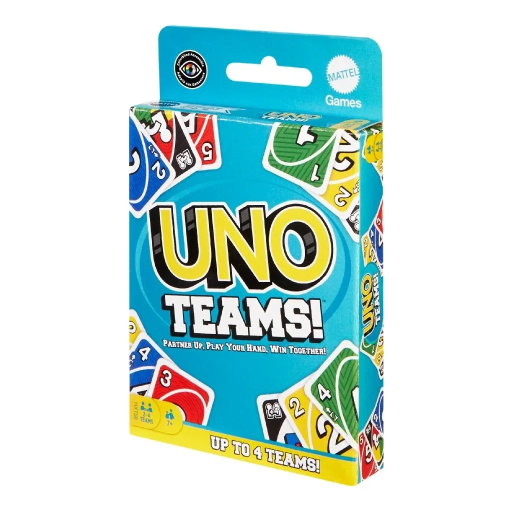 UNO Teams is een nieuwe manier om het klassieke spel te spelen! Het spel draait nog steeds om bijpassende kleuren, cijfers en symbolen, maar in plaats van ieder-voor-zich, vormen 2 spelers een team dat samen speelt om te winnen. Speciale kaarten en regels helpen de teamgenoten om samen te werken, maar beide spelers moeten al hun kaarten kwijtraken om te winnen. En vergeet niet 'UNO!' te roepen als jij (of je partner!) nog maar 1 kaart over hebt!