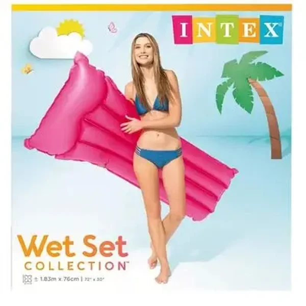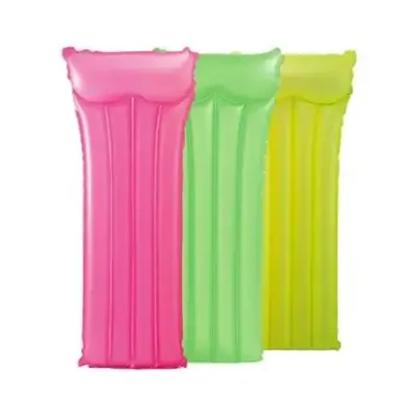 Intex transparant matras, met afmetingen 183 x 76 cm. Een klassieke opblaasbare mat in effen kleur, transparant, van pvc met 0,2 mm dikte. Wordt in assorti kleuren geleverd in polybag met kopkaart.