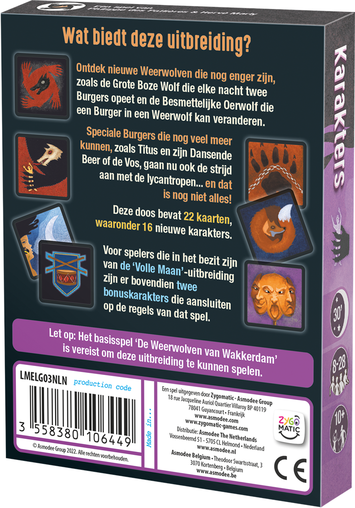 Karakters is een uitbreidingsset voor het spel De Weerwolven van Wakkerdam en geeft spelers de beschikking over 22 kaarten, waaronder 16 nieuwe karakters die allemaal van invloed zijn op het spelverloop. Ook biedt deze uitbreiding 2 bonuskarakters die je kunt spelen als je de uitbreiding Volle Maan ook gebruikt.