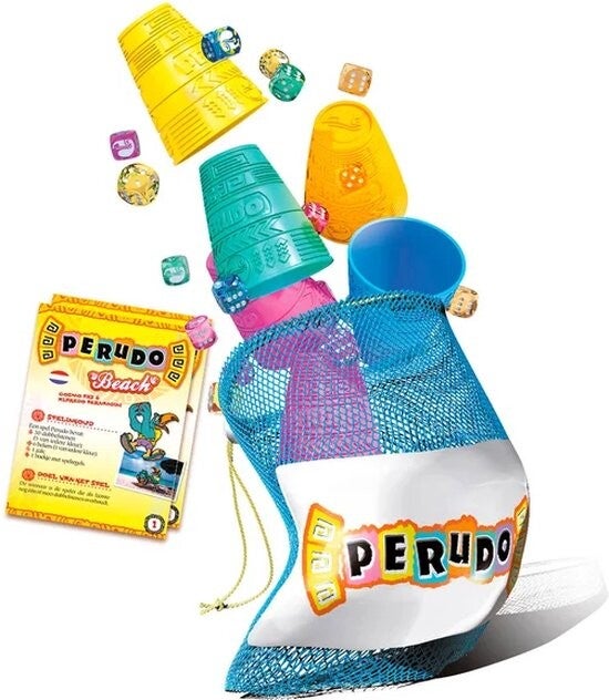 Perudo Beach is een variant van Perudo, maar dan met een zomerse twist! Deze Beach versie van het bekende Perudo spel is volledig waterproof en voorzien van een strandtasje, dus ideaal om mee nemen voor tijdens de vakantie! Inhoud: 1 waterproof strandtasje met 30 zomerse dobbelstenen, 6 plastic bekers en spelregels.