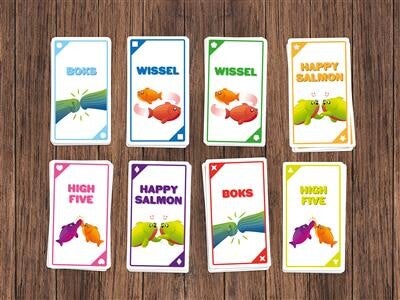 Tijdens een potje Happy Salmon probeer je zo snel mogelijk van je kaarten af te komen door een andere speler te vinden die dezelfde actie moet uitvoeren. Heb je die gevonden, dan voeren jullie de actie samen uit. Daarna mogen jullie de kaarten afleggen. Zo geef je elkaar high fives, de vuist, de enige echte Happy Salmon move of wissel je met elkaar van plaats. Wie in deze chaos als eerste zijn kaarten kwijt is, wint!